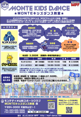 お知らせ News TOP お知らせ 2026年 4月 総合型クラブ 【総合型SC】2026年度 MONTEキッズダンス教室の参加者募集について 2026年4月2日(木) 総合型クラブ モンテディオ山形スポーツクラブ 総合型地域スポーツクラブでは小学生・中学生を対象とした「MONTEキッズダンス教室」を実施いたします 。是非ご参加ください 。※詳細は下記リンク先ページ・またはチラシをご覧ください。 ▶MONTEキッズダンス教室 チラシダウンロード(画像をクリックするとPDF版参加申込書をダウンロード頂けます) 新しいニュース一覧古いニュース